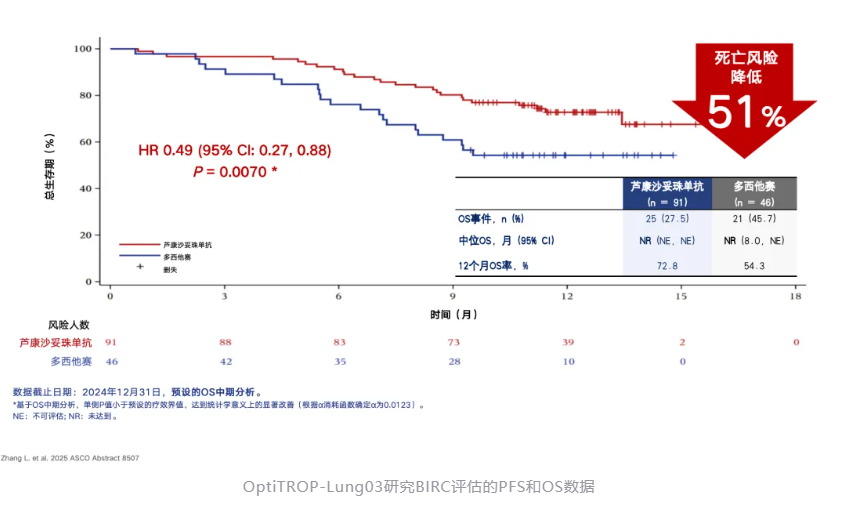 依托OptiTROP-Lung03研究,芦康沙妥珠单成为全球首个获批肺癌适应症的TROP2 ADC。更凭借该研究卓越的疗效和安全性结果,全文发表于医学四大顶刊之一的The BMJ 杂志,奠定了芦康沙妥珠单抗在EGFR突变NSCLC三线治疗中的标准治疗地位。作为一项多中心、开放标签、随机对照临床试验,OptiTROP-Lung03研究旨在比较芦康沙妥珠单抗与多西他赛在EGFR-TKI和含铂化疗失败NSCLC患者中的疗效和安全性4。研究结果惊艳:芦康沙妥珠单抗组ORR达45%,较多西他赛组(16%)提升近两倍;疾病控制率(DCR)亦显著高于对照组(82% vs 60%)。更令人关注的是,芦康沙妥珠单抗将患者中位PFS延长至6.9个月,较对照组(2.8个月)显著降低疾病进展或死亡风险达70%;同时,患者总生存期(OS)相较多西他赛组也取得了具有统计学意义和临床价值的显著改善,中位OS尚未达到,显著降低患者死亡风险达51%。基于这一结果,芦康沙妥珠单抗成为唯一同时入选国内两大权威指南《CSCO非小细胞肺癌诊疗指南》和《中华医学会肺癌临床诊疗指南》的TROP2 ADC,获推荐用于治疗EGFR突变耐药的晚期NSCLC。