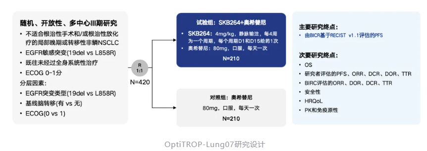 在攻克了EGFR-TKI耐药治疗难题后,芦康沙妥珠单抗的研究者们并未止步,而是向一线治疗发起挑战。目前已经启动的OptiTROP-Lung07研究采用芦康沙妥珠单抗联合奥希替尼的方案,与奥希替尼单药治疗进行头对头比较,探索这一联合策略在EGFR突变NSCLC一线治疗中的临床价值。这一方案有望为EGFR突变肺癌一线治疗开辟全新治疗路径,从而进一步提升患者的总生存获益,推动该领域治疗格局的再次重塑。