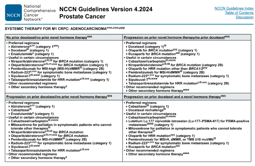 对于转移性CRPC,NCCN指南推荐的一线方案为新型激素(内分泌)治疗与化疗。然而在新型激素和化疗治疗失败后,后续可选方案虽包含PARP抑制剂、免疫治疗及放射性药物,但疗效普遍有限,临床上仍缺乏广泛适用且效果明确的后线治疗手段2,3。