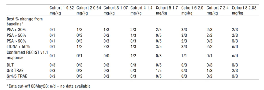由Ambrx(后被强生收购)开发的PSMA ADC药物ARX517,其治疗mCRPC患者1/2期研究结果曾于2023 ESMO大会上公布。入组患者100%接受过≥1种激素治疗,50%接受过紫杉烷类药物,12.5%接受过PSMA靶向放射性核素治疗,在较高剂量组(1.4mg/kg-2.88mg/kg)中,可观察到>50%的PSA和ctDNA下降;2例患者(2/7)达到经RECIST v1.1标准确认的客观缓解6。