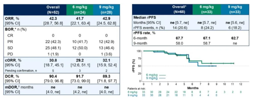 安全性方面,两个剂量组均未发生剂量限制毒性(DLT),4 mg/kg组未发生治疗相关死亡,5 mg/kg组出现1例治疗相关死亡。疗效数据如下表(数据截至2024年11月18日):